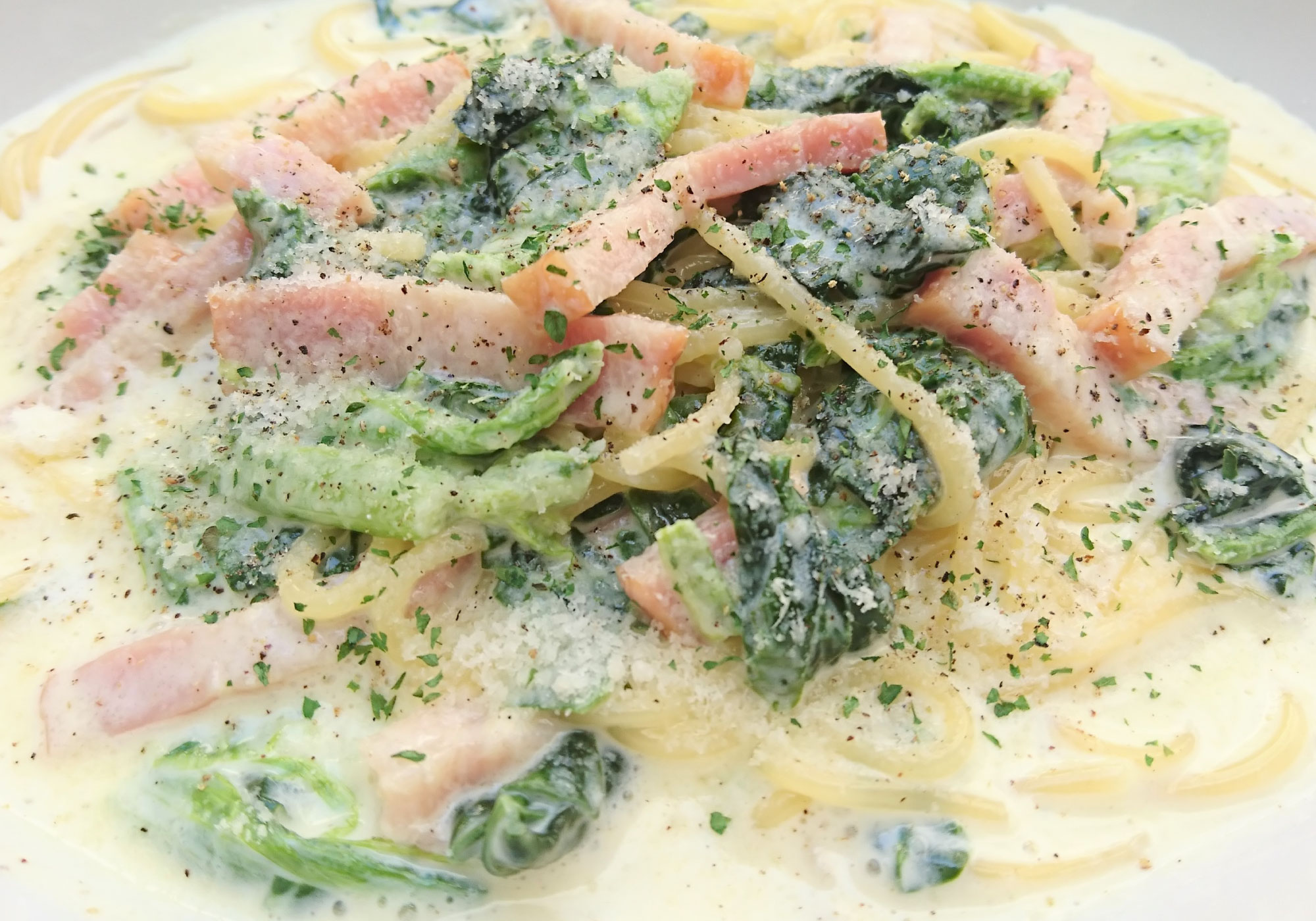 ベーコンとほうれん草のクリームパスタ 1100ベーコン、ほうれん草、生クリーム