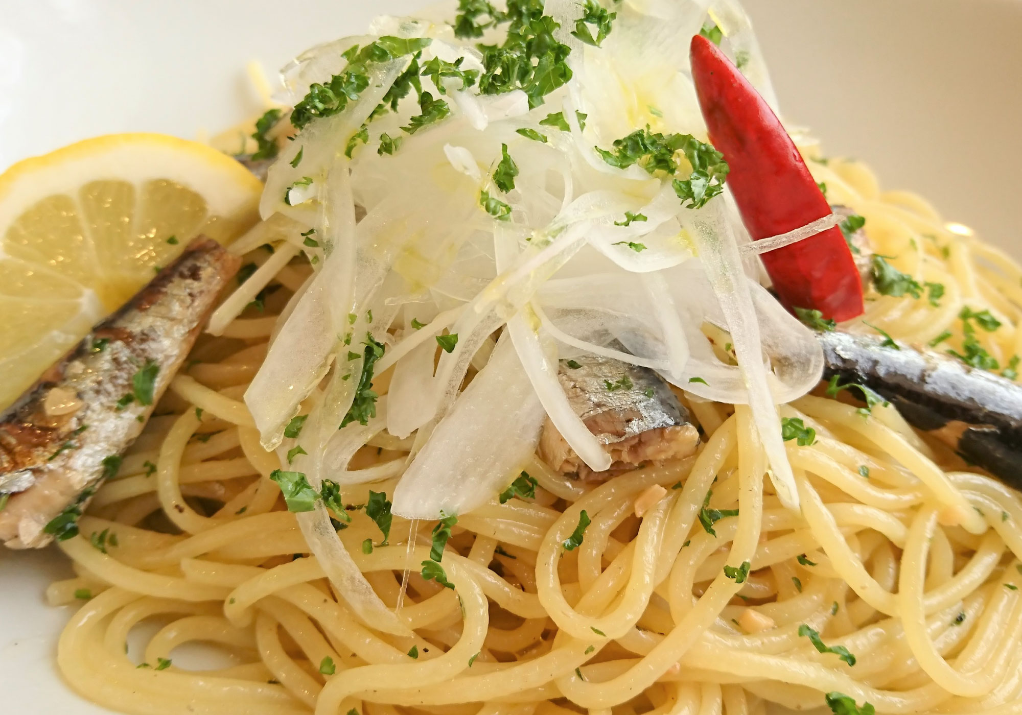 オイルサーデンとレモン・パセリ 1100オイルサーデンを使った旨味たっぷりのオイル系パスタに、レモンを絞ることで味に革命を?