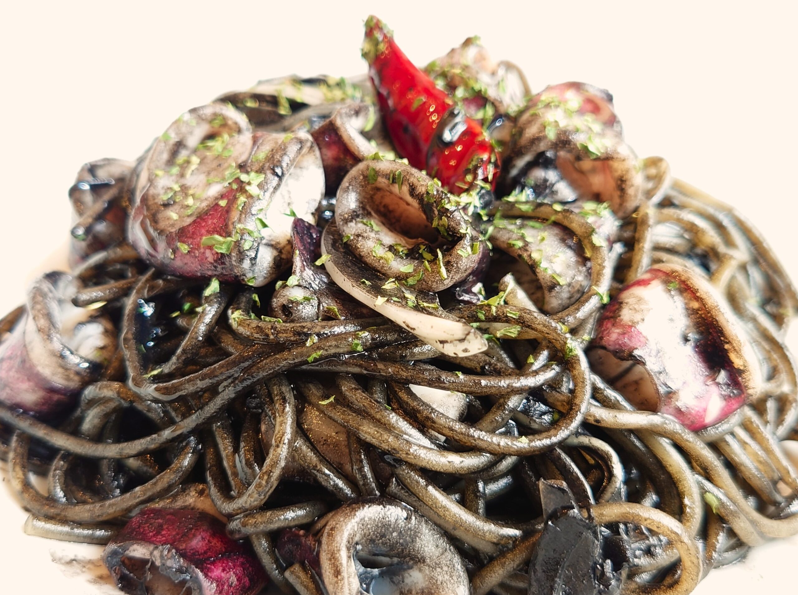 アンチョビの風味を効かせたヤリイカとイカスミの入ったオイル系パスタ