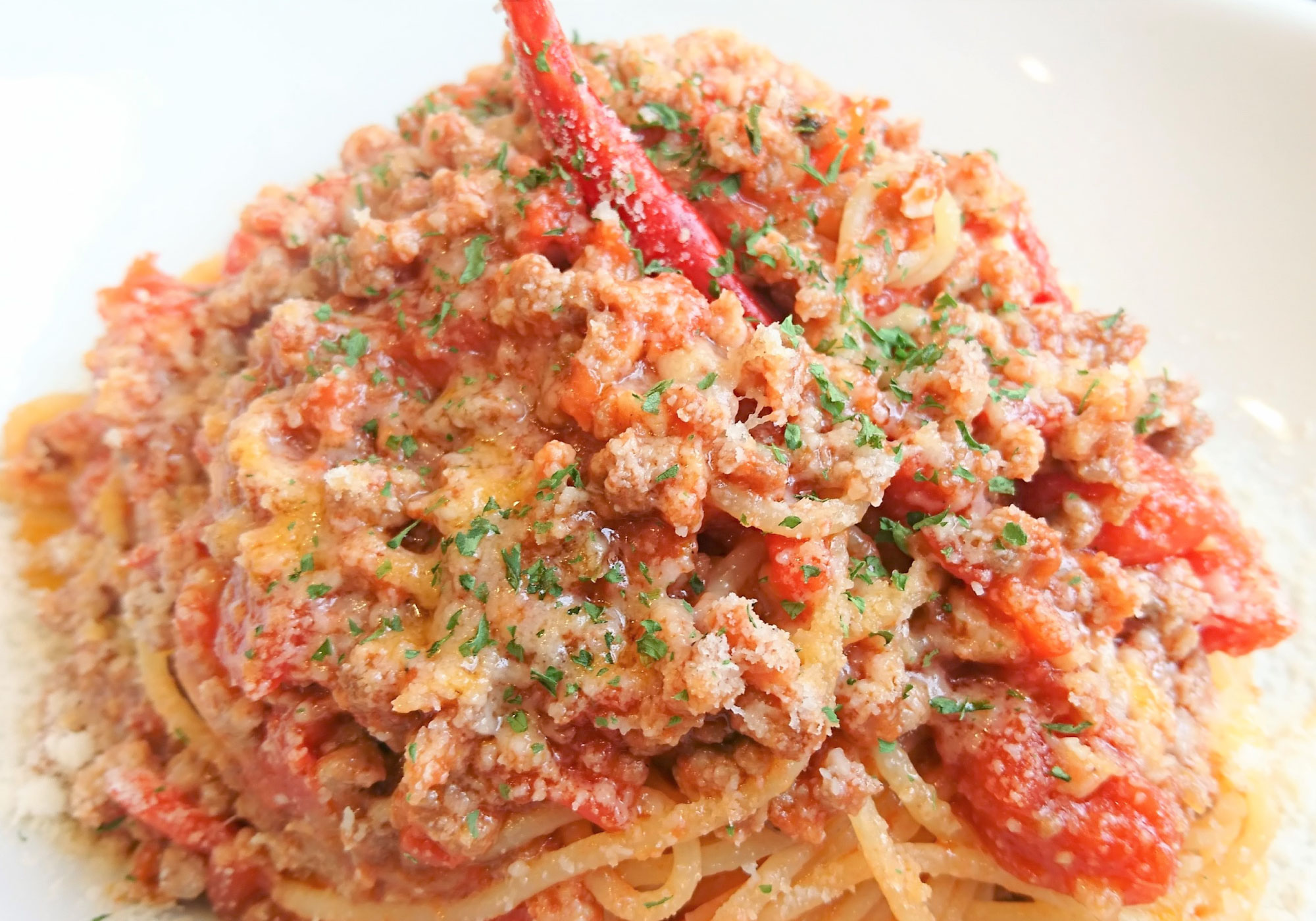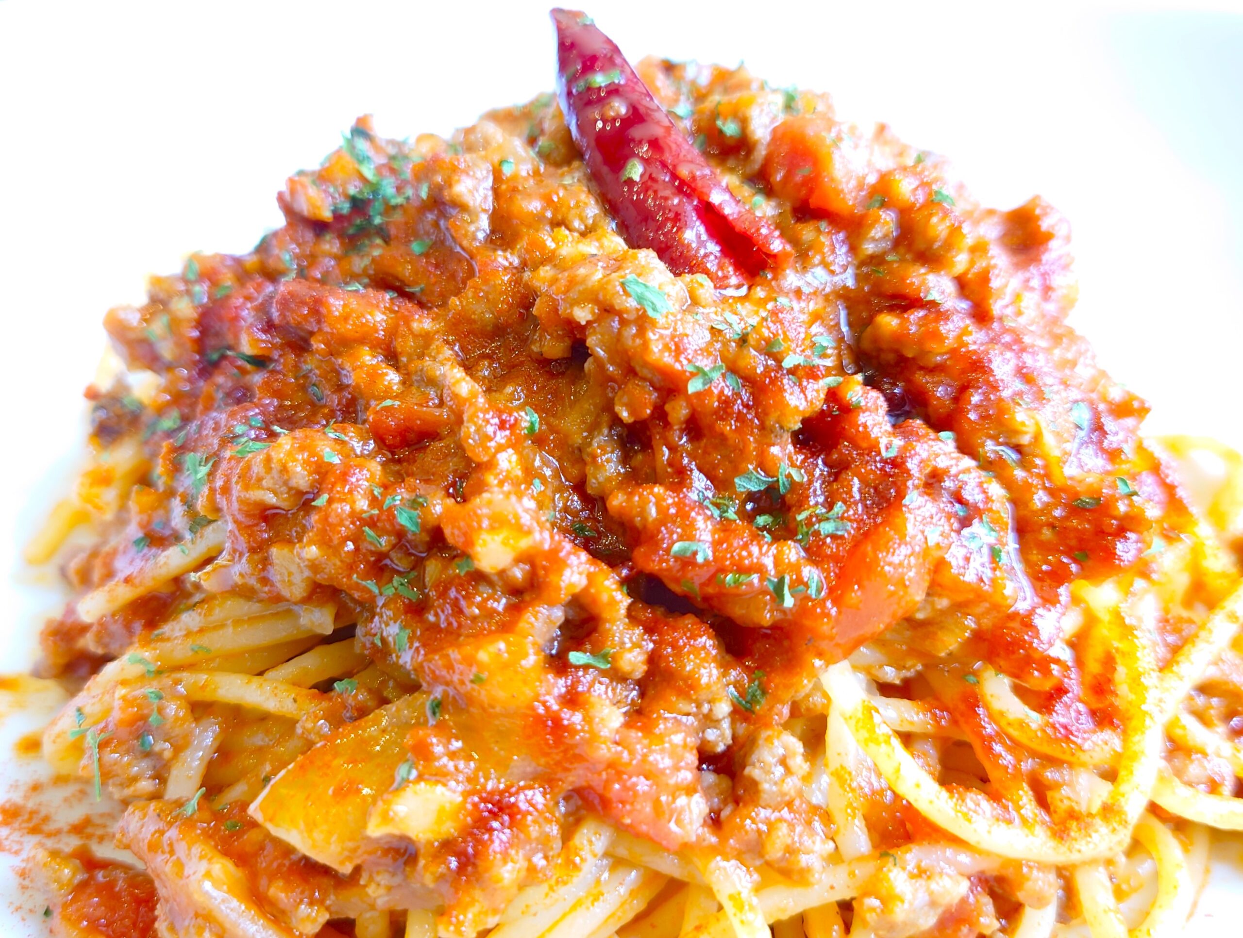 ミートパスタにイタリアのサルサソースを加えたピリ辛ボロネーゼ