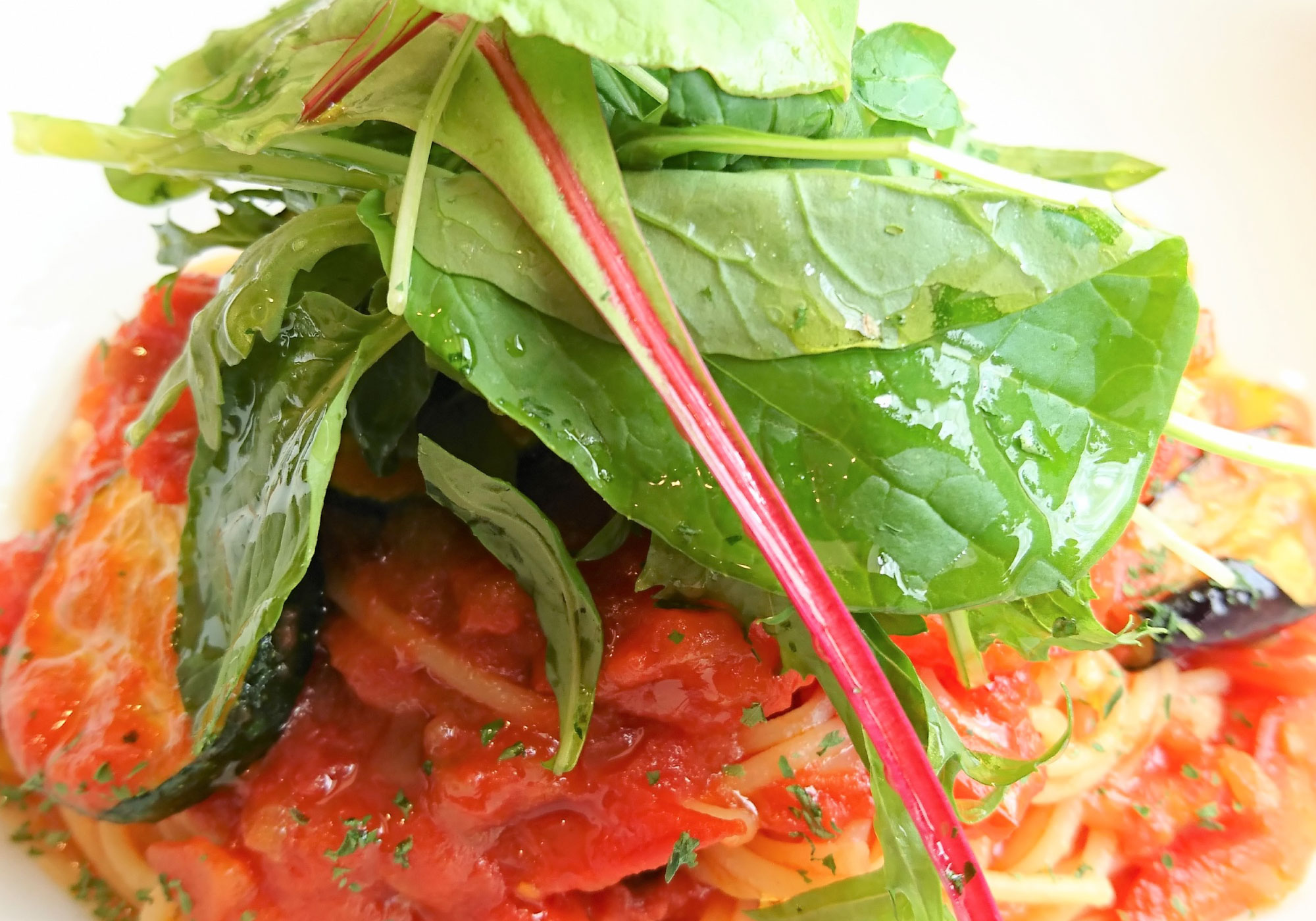 フレッシュトマトとベビーリーフのパスタ 980仕上げにフレッシュトマトのざく切りを加えたあっさりとしたサラダ感覚のシンプルなトマトパスタ